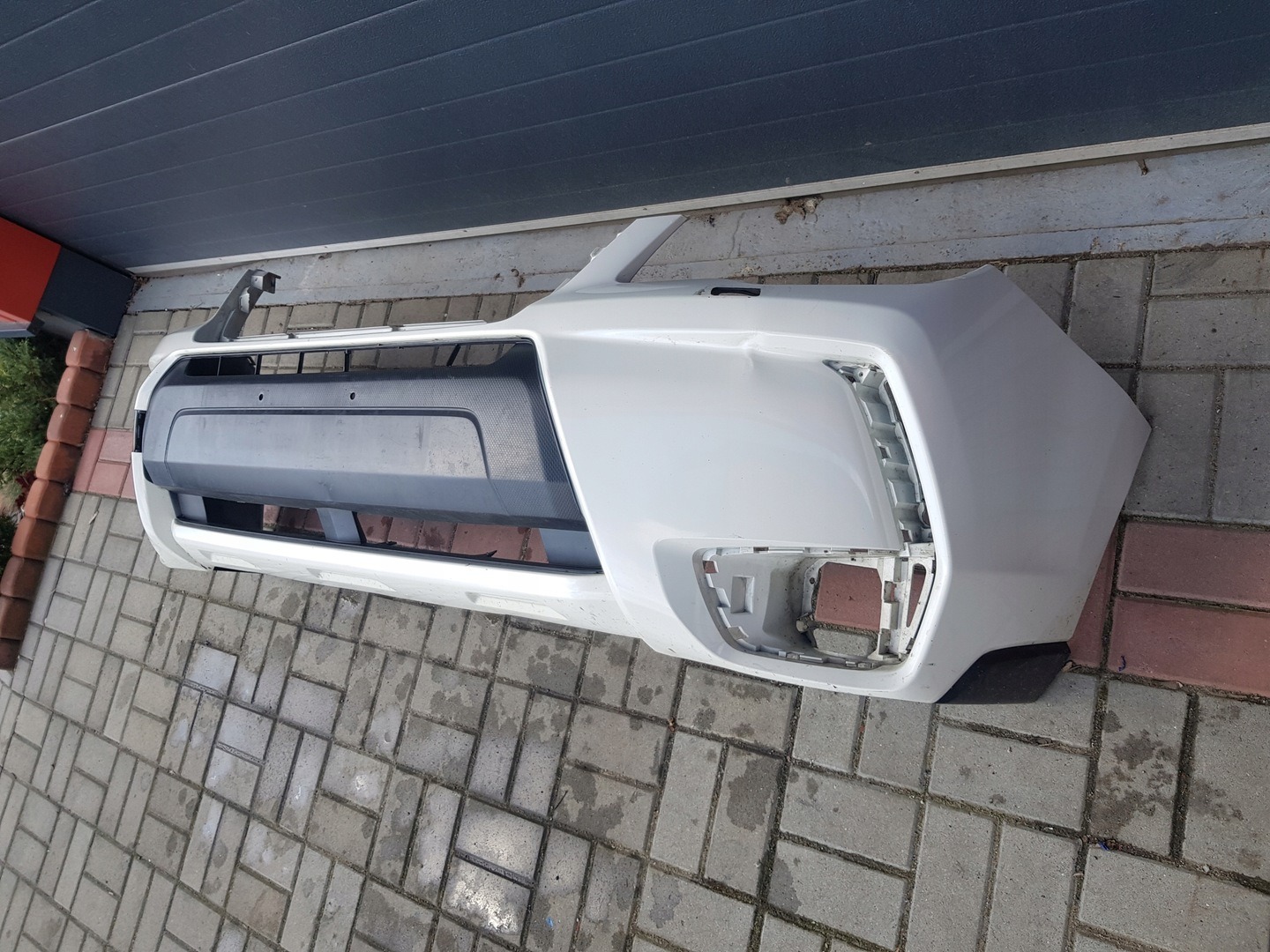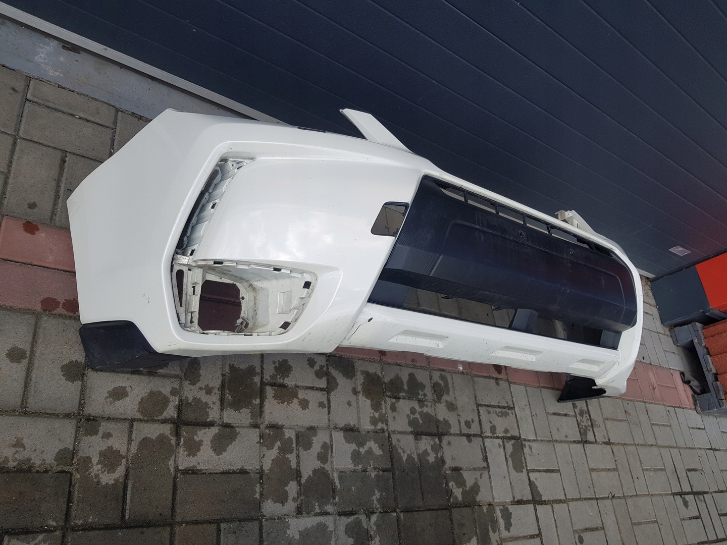 The bumper cover has no major cracks or damage, there is two damaged fender retainers as shown. The panel does have two holes for a quick release, drilled near the outer mounting brackets, as shown in the photos. There is also some indentions and deeper scuffs on the bottom and lower portions of the panel as shown. We suggest having these holes professionally filled in and refurbished prior to use.